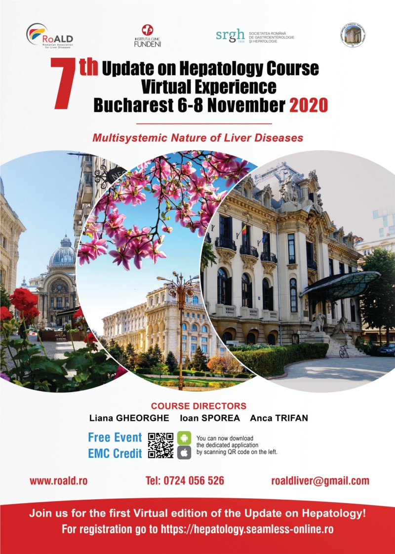 In locul unui eveniment fata-in-fata, in contextul fara precedent al pandemiei SARS-CoV-2, Comitetul Director al RoALD si Comitetul de Organizare al Update on Hepatology Course, au luat decizia de a transforma cursul Update on Hepatology 2020 cu tema „Multisystemic nature of liver diseases” intr-o experienta virtuala de exceptie intre 6-8 noiembrie 2020.