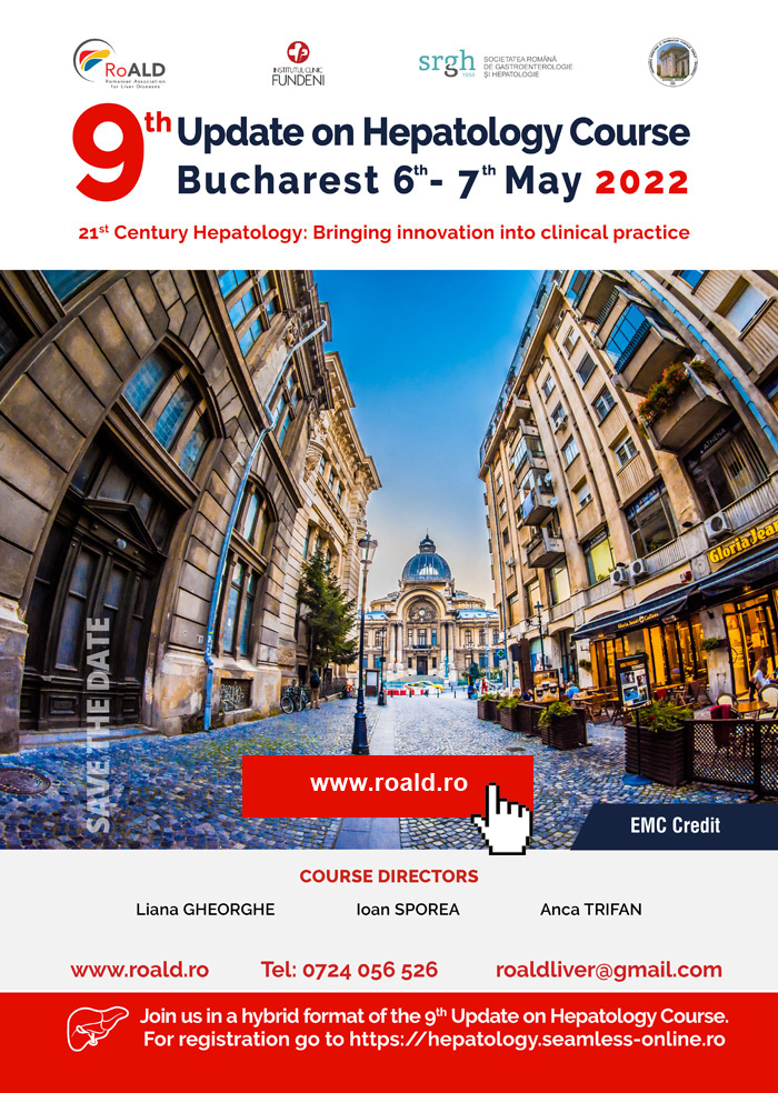 Cu speranta ca 2022 ne va readuce bucuria socializarii si interactiunilor medicale in-persoana, Comitetul Stiintific si de Organizare va invita la cea de a 9-a editie a cursului anual Update on Hepatology cu tema “21st Century Hepatology: Bringing innovation into clinical practice” in 6-7 mai 2022, la hotelul Crowne Plaza Bucuresti.