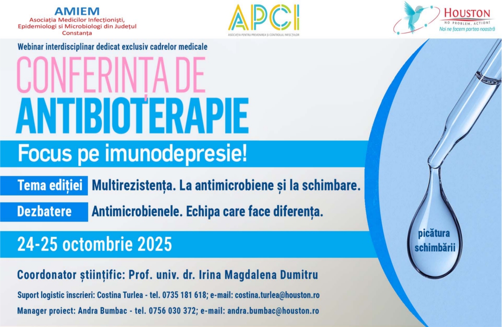 Pentru a răspunde acestor realități, vă invităm la Conferința de antibioterapie – Focus pe imunodepresie, care va avea loc în perioada 24–25 octombrie 2025, sub coordonarea științifică a Prof. univ. dr. Irina Magdalena Dumitru.