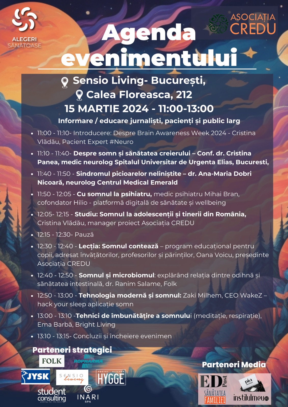 Sub umbrela Brain Awareness Week, Asociația CREDU vă invită să participați la conferința dedicată "Zilei Mondiale a Somnului 2024". Evenimentul face parte din seria de conferințe Alegeri Sănătoase și este dedicat conştientizării importanței somnului asupra sănătății generale şi este dedicat jurnaţiştilor, pacienților şi publicului larg.